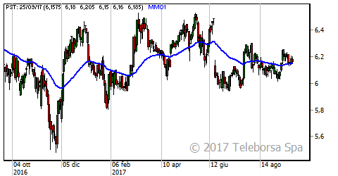 Poste Italiane presenta un trend rialzista di medio periodo che ha preso avvio dai minimi di 5,50 euro, visti nel mese di novembre 2016, fino ai massimi di maggio 2017 individuati a 6,50 euro, per poi riposizionarsi in area 6,15 euro.