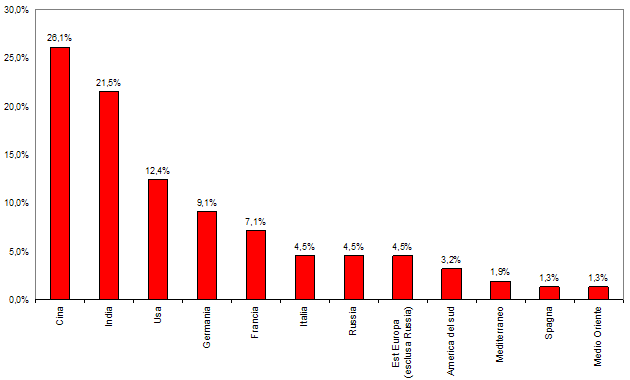 L'Italia, che nelle preferenze geografiche non strategiche risultava preponderante, scende al sesto posto con il 4,5% del campione e al terzo posto in Europa dopo Germania e Francia. Cina e India insieme raggiungono il 47,6% del campione.