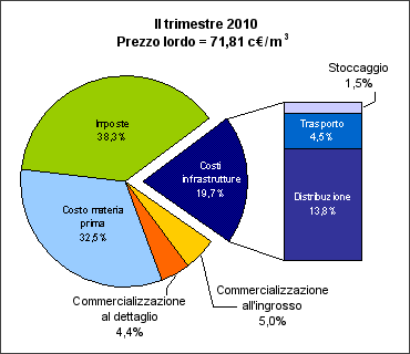 Il grafico, tratto direttamente dalla banca dati dell'AEEG, non lascia più dubbi. Tolto un 20% dei costi per le infrastrutture, un altro 10% per i costi di commercializzazione e poco più del 30% quale costo secco della materia prima, resta oltre il 38% di imposte. E che imposte!